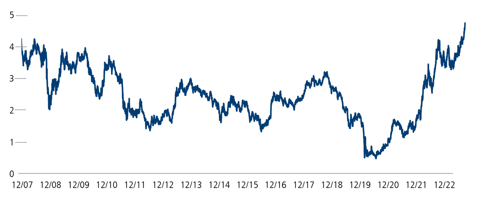 Higher interest rates are problematic for equities for a variety of reasons—higher rates ultimately lead to increased borrowing costs for companies and individual borrowers alike, which may create economic headwinds and crimp overall consumer and business spending. We have seen that equity valuations are also intricately linked to the long end of the yield curve and will, over long periods of time, generally fall as rates rise, and vice versa. Accordingly, as long-term Treasury yields have spiked to levels that we haven’t seen since before the Great Financial Crisis of 2008 (Figure 2), equities have come under renewed pressure (Figure 3).