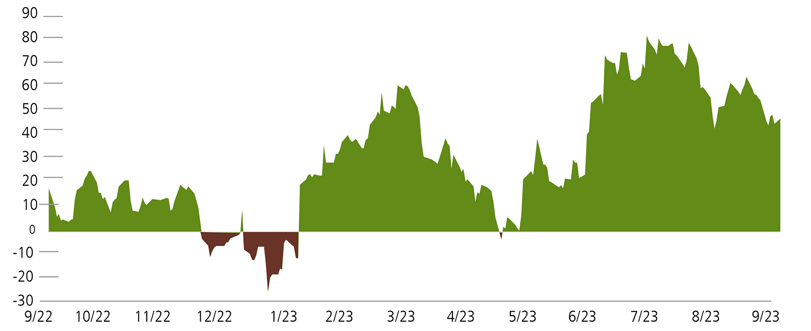 As the third quarter began, markets reflected investors’ upbeat mood, but this positive sentiment fizzled as the quarter wore on. Despite a steady stream of economic data continuing to surprise on the upside (Figure 1), investors became increasingly unsettled as they looked forward. Rising energy prices and rekindled inflation fears led to a ramp up in 10-year Treasury yields and deepened concerns about the sustainability of corporate earnings, the health of the consumer and economic growth overall. And although the Federal Reserve paused its rate tightening in September, the decision provided little comfort to markets as the central bank dashed hopes of imminent rate cuts by reinforcing prior guidance that rates would be higher for longer.