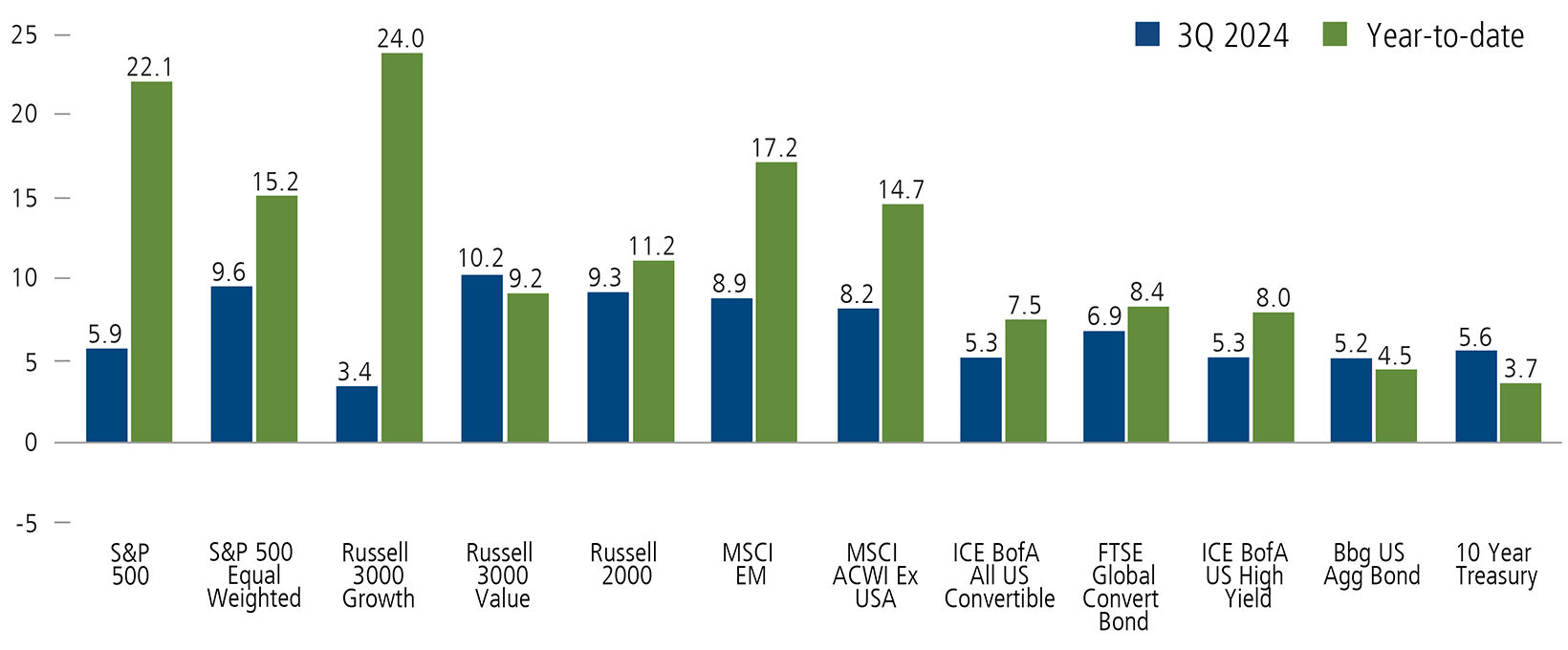 Indexes are unmanaged, do not include fees or expenses and are not available for direct investment. The S&P 500 Index is considered generally representative of the US equity market and is market cap weighted. The S&P 500 Equal Weighted Index includes these same companies but is not market cap weighted. The MSCI All Country World ex USA Index represents the performance of global equities, excluding the US. The MSCI Emerging Markets Index is a measure of the performance of emerging market equities. The ICE BofA US High Yield Index is an unmanaged index of US high yield debt securities. The ICE BofA All US Convertible Index (VXA0) is a measure of the US convertible market. The FTSE Global Convertible Bond Index measures the performance of the global convertible. The Bloomberg US Aggregate Index is a broad based benchmarks of the U.S. investment grade and global investment grade bond market, respectively. They include Treasury, government related, corporate and securitized fixed-rate bonds. The Russell 2000 Index is a measure of US small cap performance. The Russell 3000 Index measures the performance of 3,000 publicly held US companies based on total market capitalization, which represents approximately 98% of the investable US equity market. The Russell 3000 Growth Index is representative of those Russell 3000 Index companies with higher price-to-book ratios and higher forecasted growth values. The Russell 3000 Value Index is representative of those Russell 3000 Index companies with lower price-to-book ratios and lower forecasted growth values.