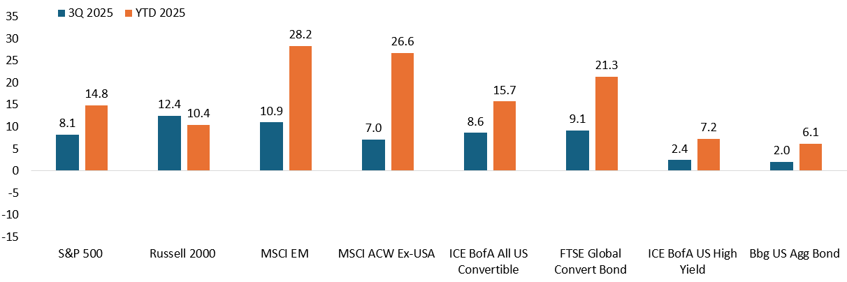 Stocks, convertibles and fixed income markets all advanced during the third quarter. As the Fed cut rates, US small caps surged, coming off the heels of a historically long stretch of underperformance relative to large caps. The MSCI Emerging Market Index also posted double-digit gains.