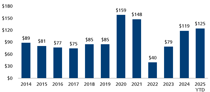 We increased the fund’s convertible arbitrage weighting during the quarter, driven by exceptional new issuance opportunities. The US convertible market saw over $33 billion in new deals during the third quarter—a dramatic increase from the roughly $10 billion issued in the third quarter of 2024. For the year-to-date, US convertible issuance is on a pace to beat 2001’s record issuance of $106 billion. Global year-to-date issuance has already surpassed full-year issuance for 2024 and is also in striking distance of 2020 and 2021. This increased issuance expands the opportunity set and has refreshed the convertible market, providing opportunities for pricing arbitrage as issuers compete for investor dollars.